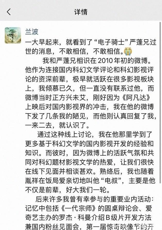 这些碎片拼起来,是一个在内容前线冲锋、又愿意在幕后托举的人 他参与策划开发过不少科幻项目,也不吝把经验交给后辈 有人说,他像给行业铺路的人,偶尔停下脚步,回头把手伸给还在摸索的人 他做过的事,也许不会立刻被看见,但会在明年的片单里,在某个年轻创作者的第一条分镜里,慢慢显形 更扎心的是,很多话他已经写在书页上、写在微博里,甚至写进那两首无题诗 朋友们反复转发,像在确认他留下的坐标 当我们在热搜里讨论下一部大片的宇航服是否真实时,也该留出一点耐心给“为什么”和“怎么做得更好” 这话听起来普通,但在他身上,常常落实为具体的注释、一段脚注、一份资料链接 我想,真正的告别不是一次转发或一束花,而是把一件事做得更认真一点 一个愿意在幕后默默抬杠的人,会影响你看世界的角度 愿他在另一个时空继续点亮屏幕,我们在这里继续把灯传下去